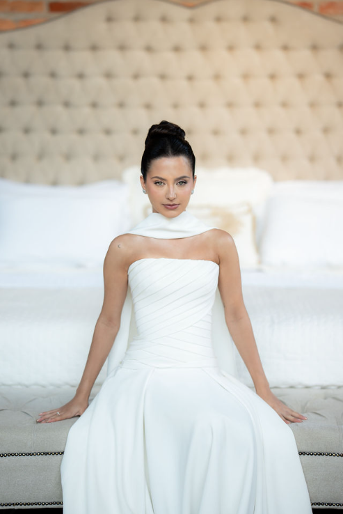 O modelo escolhido para o Editorial Fidelis traz um decote reto, sofisticado em sua simplicidade, que valoriza a região do colo com discrição e elegância. O busto drapeado acrescenta textura e movimento, em uma leitura moderna de um acabamento que remete aos clássicos da alta-costura. Já a saia ampla e volumosa — característica marcante dos vestidos de estilo princesa — reforça o ar majestoso da produção, equilibrando tradição, modernidade e minimalismo.