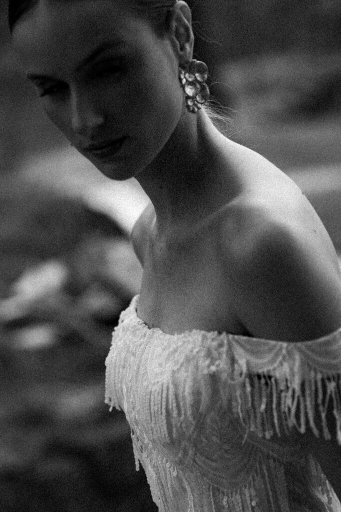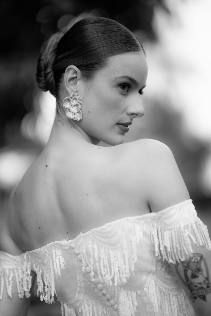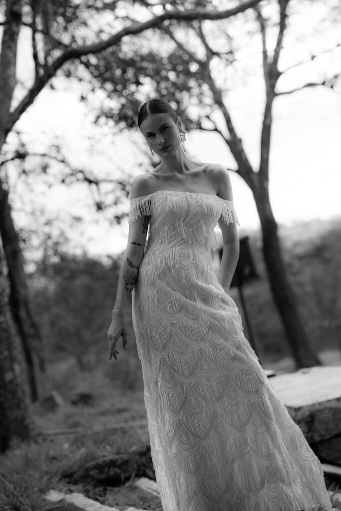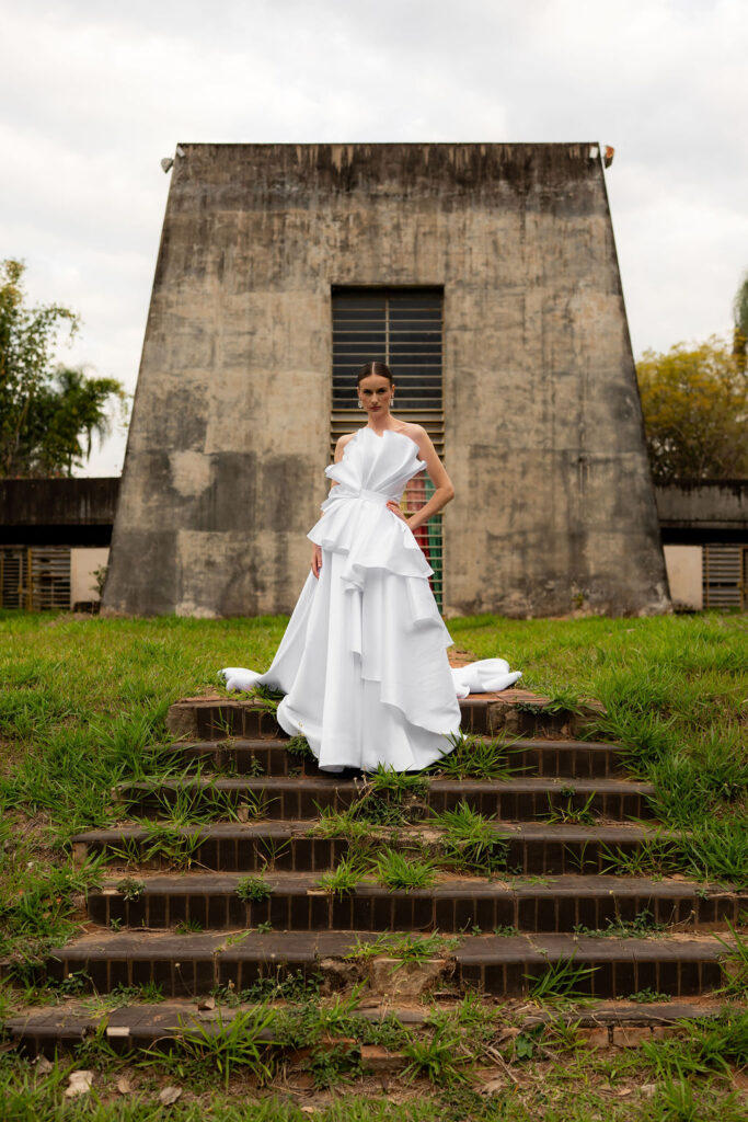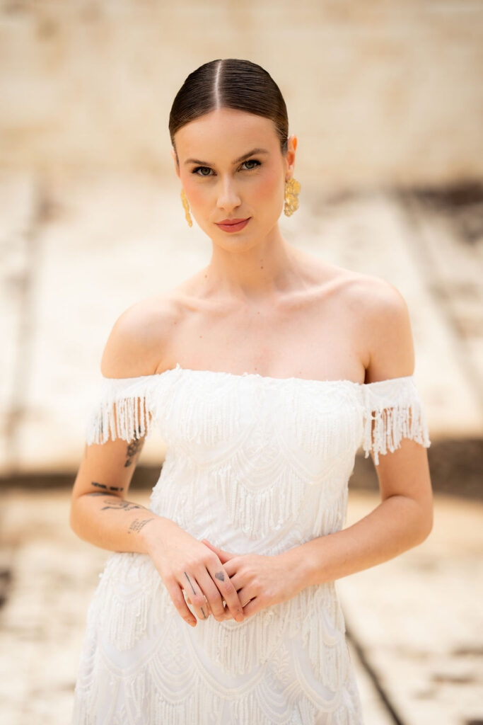 Neste editorial, a Clamore traduziu sentimentos em formas, luz e movimento. Foram dois modelos que traduzem muito da essência da marca. O primeiro, com franjas de paetê e um decote reto ombro a ombro confirmam que qualquer tendência ganha repaginação com as nossas estilistas. O segundo, vem para mostrar que a alfaiataria pode ir muito além do clássico, por meio de um decote drapeado, volumoso e criativo. Tudo é linguagem. Tudo é arte. O cenário, pensado para contrastar o tempo, reforça o conceito: o casamento como um ato de criação artística, sensível e profundo.